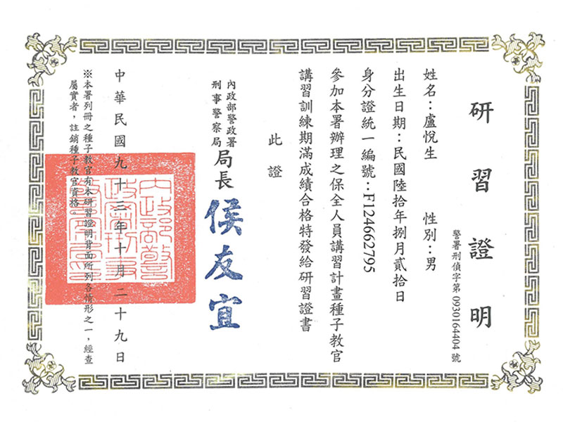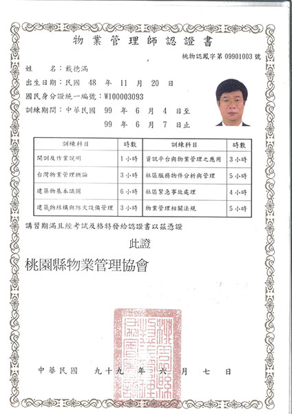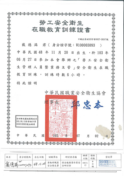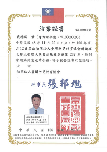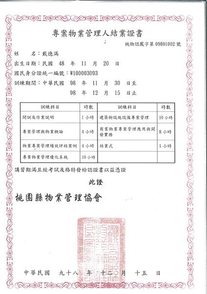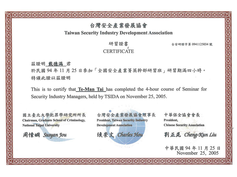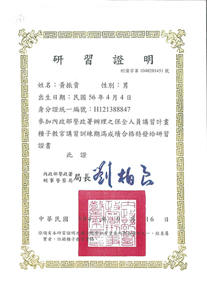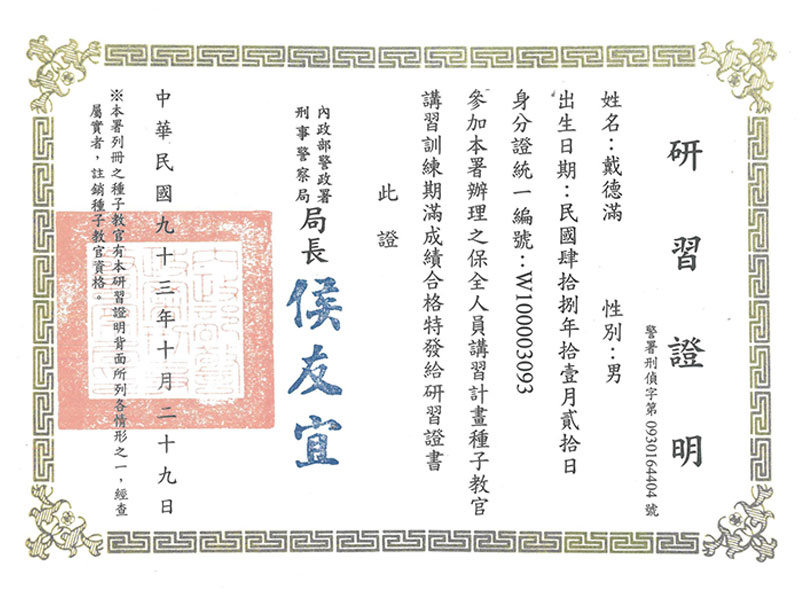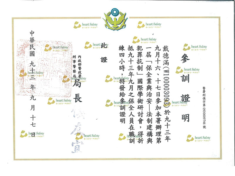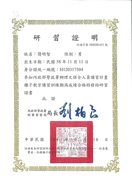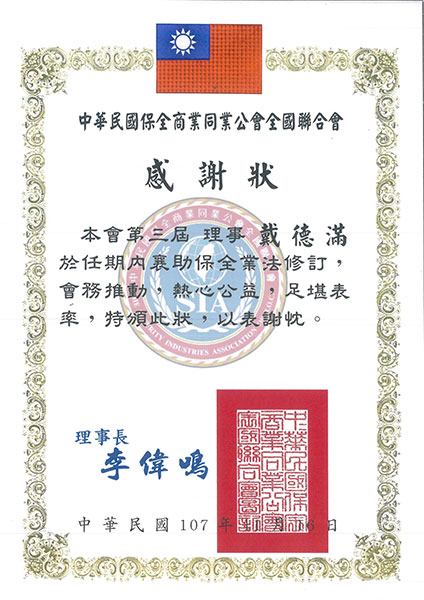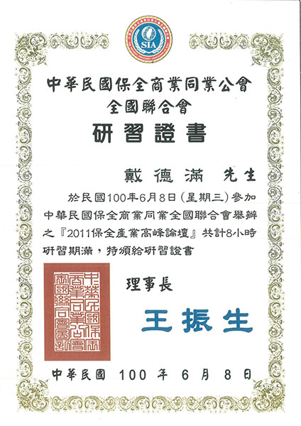 榮譽實績 首頁 關於我們 榮譽實績 研習證明 台灣安全產業發展協會研習證明 保全治安參訓證明 種子教官研習證明 種子教官研習證明2 相關獎狀 防災教育協會結業證書 治安示範社區獎狀 保全商業公會聯合會感謝狀 保全商業全國聯合會研習證書 保全優良廠商(彩色) 專案物業管理人結業證明 勞工安全衛生訓練證書 勞工安全衛生結業證書 物業管理師認證書 種子教官研習證明1 種子教官研習證明2 TTQS研習結訓證明 TTQS培訓講師聘書 熱心公益獎狀 嘉惠永銘獎狀